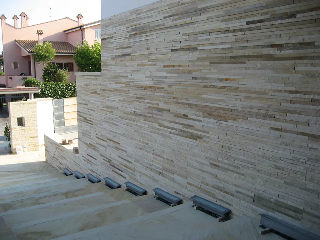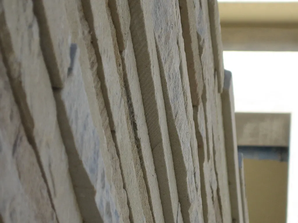 Ogni blocco è stato selezionato, tagliato e posato a mano per realizzare cornici, architravi e rivestimenti unici, impossibili da replicare industrialmente.