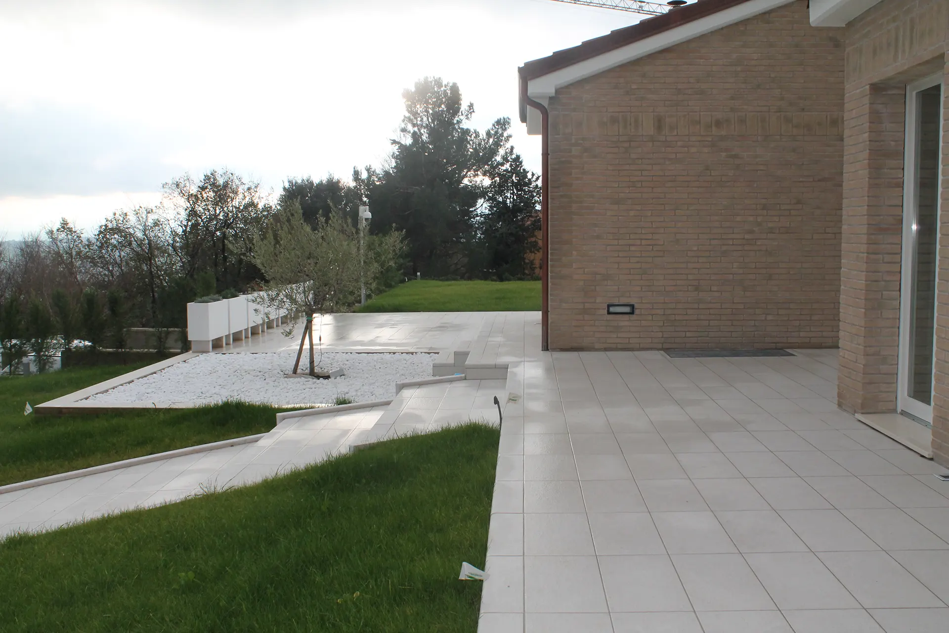 L’area esterna è stata completamente riprogettata: abbiamo lavorato su movimento terra, realizzazione del verde, impianti di irrigazione e pavimentazioni in materiali naturali. Il risultato è uno spazio armonico, funzionale e accogliente.